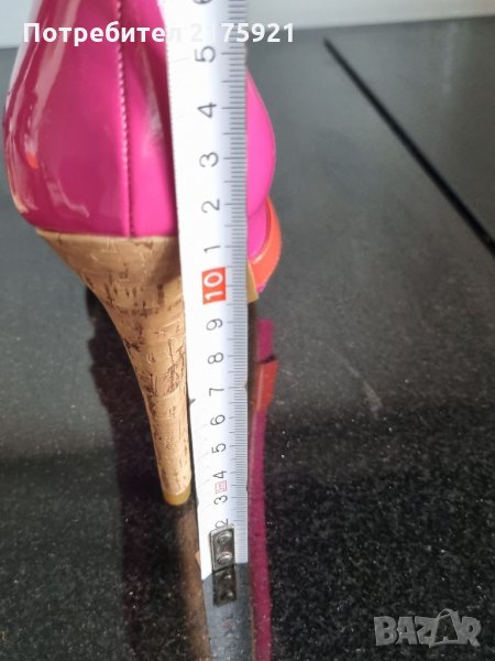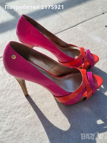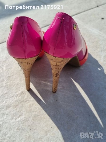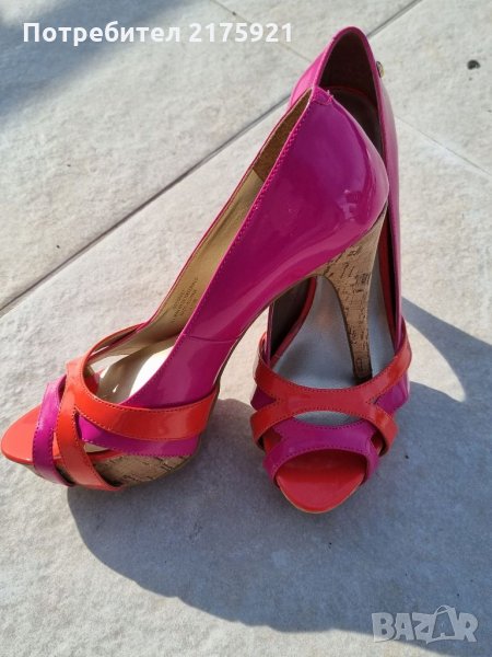 Купувани са от САЩ. Интересна комбинация от цветове.Височина на тока 11.5см ,на предната част 3см.Тока е корк,а лицевата част лак.Елегантни и стилни.