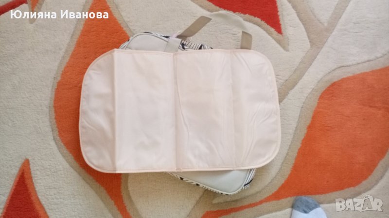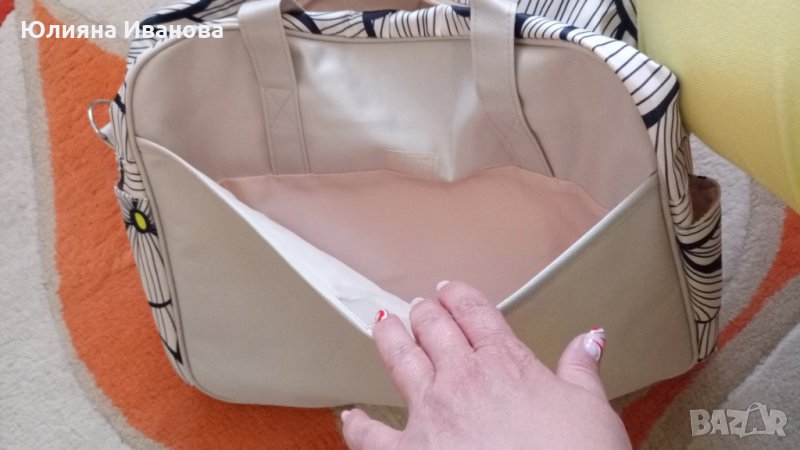 Чисто нова, удобна чанта с много приложения. Предназначена е за детска количка, но може да се носи и като дамска. Голяма и добре организирана. Плата е непромокаем и качествен.