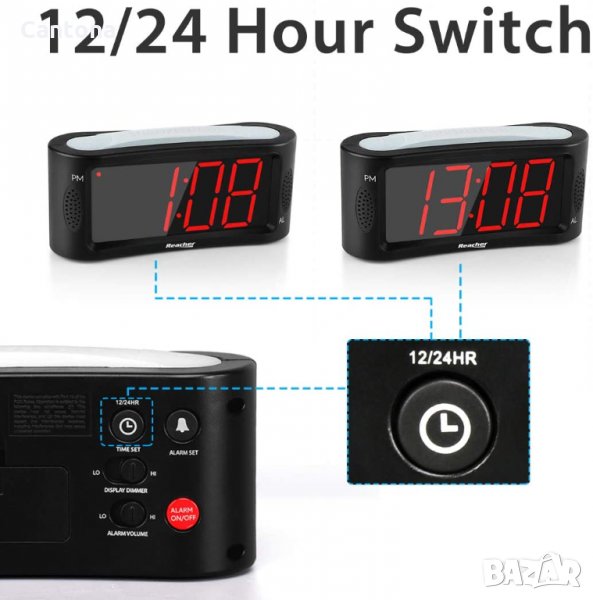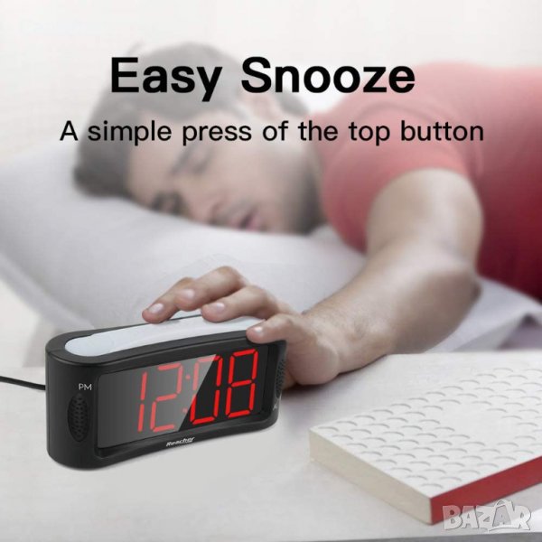 - Регулируема сила на звука на алармата Easy Snooze: Звукът на алармата може да бъде настроен на ниска или висока сила на звука, а звъненето продължава 5 минути, което гарантира, че ще се събудите. Отлагането позволява на алармите да се чуват на всеки 9 минути, докато не се изключи.