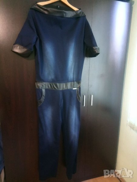 Гащеризон от еластичен тъмносин дънков плат с кожени елементи. Размера е 2XL. Ширина подмишниците 63см. Талия при колана 44см. Ханш 60см. Бедро 30см. Ширина на крачола долу 17см. Дължина на гащеризона 157см. Дължина на ръкава 27см.