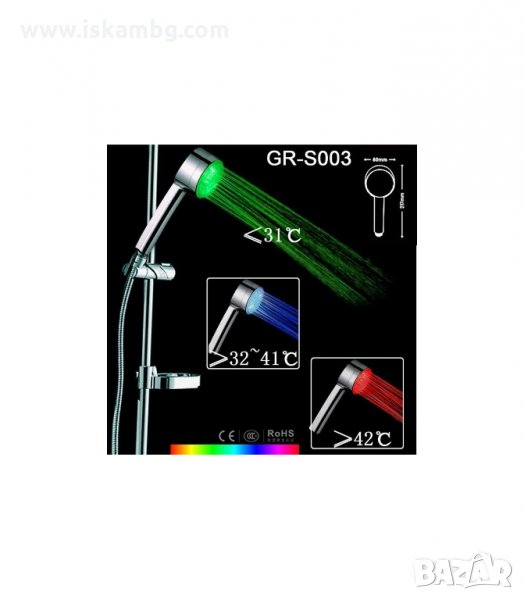3 цвята на светене: зелен/син/червен (според температурата на водата )