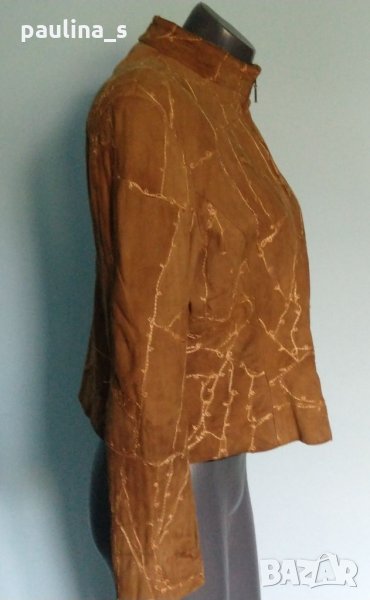 1. Декорирано яке от естествена кожа - агнешки велур. Бродериите са от копринен сатен. Като цяло дрехата е много впечатлителна и ефектна. Велурът е много капризна кожа, аз го пера с шампоан и балсам за коса. Суши се на закачалка, или се дава на химическо чистене. Якето е без дефекти. 44 европейски стандарт.