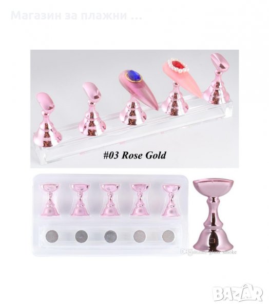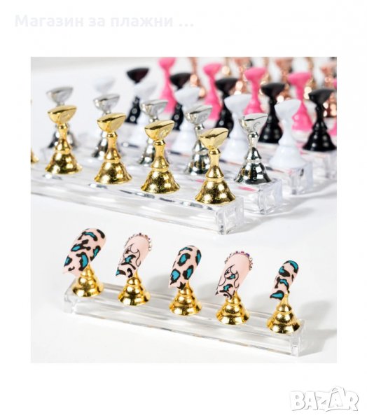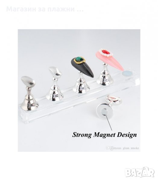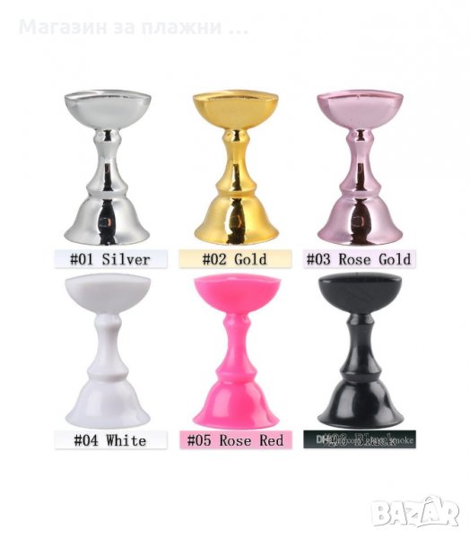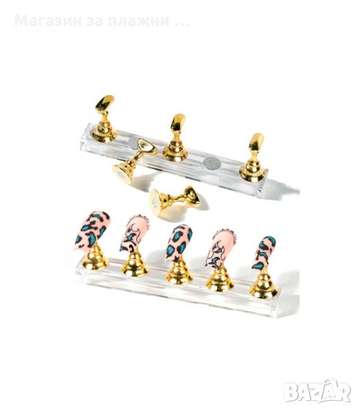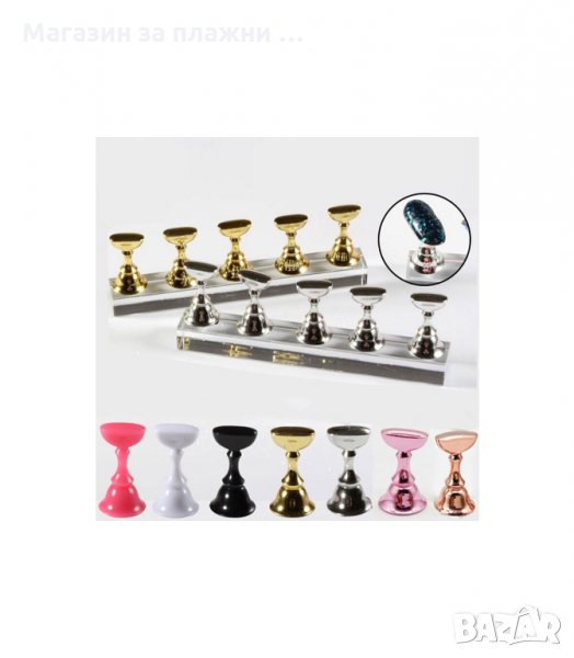 Удобни за тренировки върху изкуствени нокти. Комплектът съдържа 5 поставки и 1 стъклен диамантен държач, удобен за захващане при рисуване върху изкуствения нокът. Основа с магнит и 5 държача за мостри.