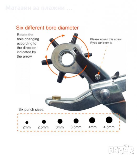 Клещи замба инструмент за пробиване на дупки на каишки за часовници, колани, кожа, пластмаса, плат, картон и др. или пробиване на отвори за поставяне на капси, рапиди, копчета за дънки или други дейности - 2мм, 2.5мм, 3мм, 3.5мм, 4мм, 4.5мм