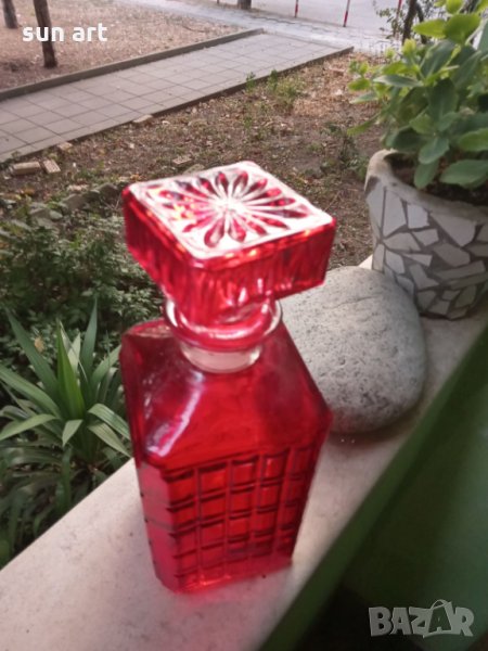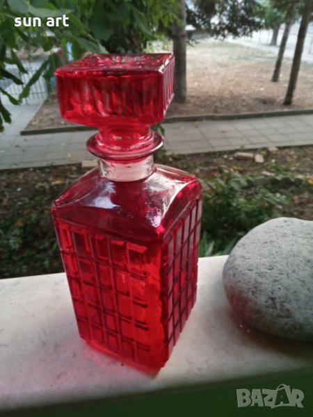 червена стъклена бутилка с релефни орнаменти -гарафа за спиртни напитки ,700мл