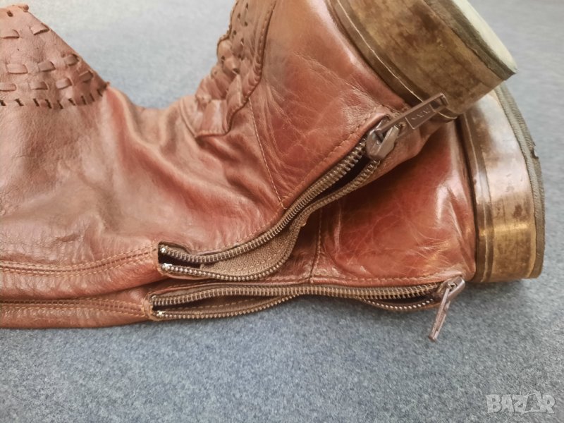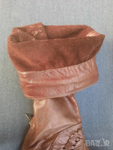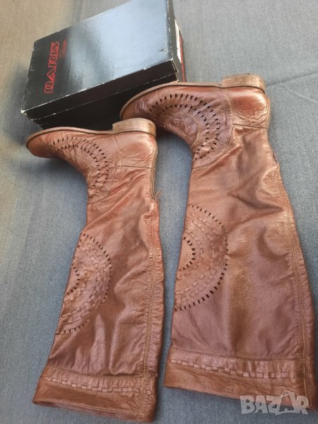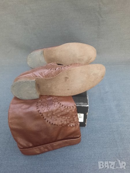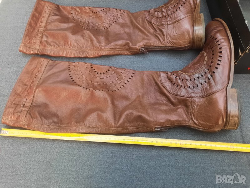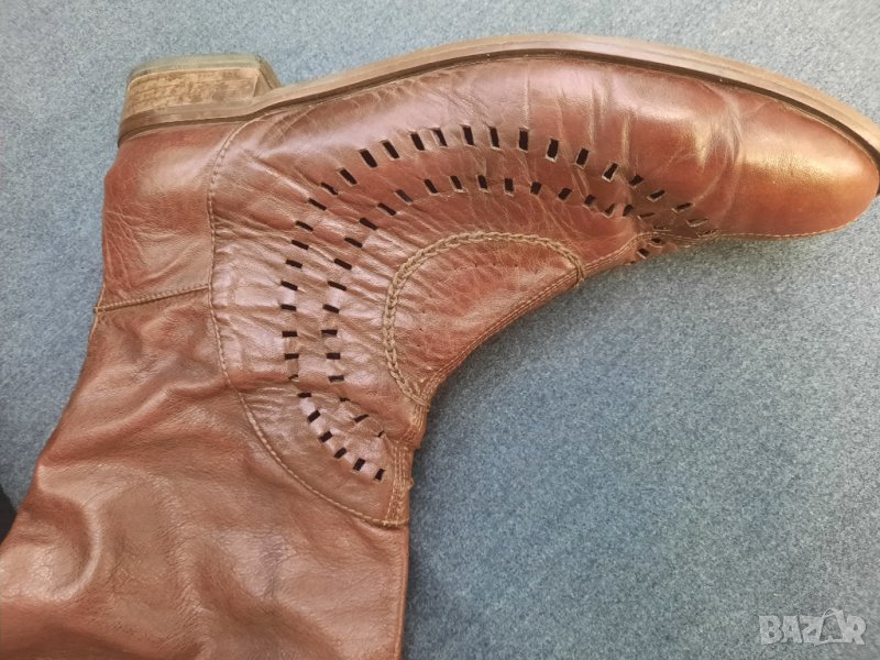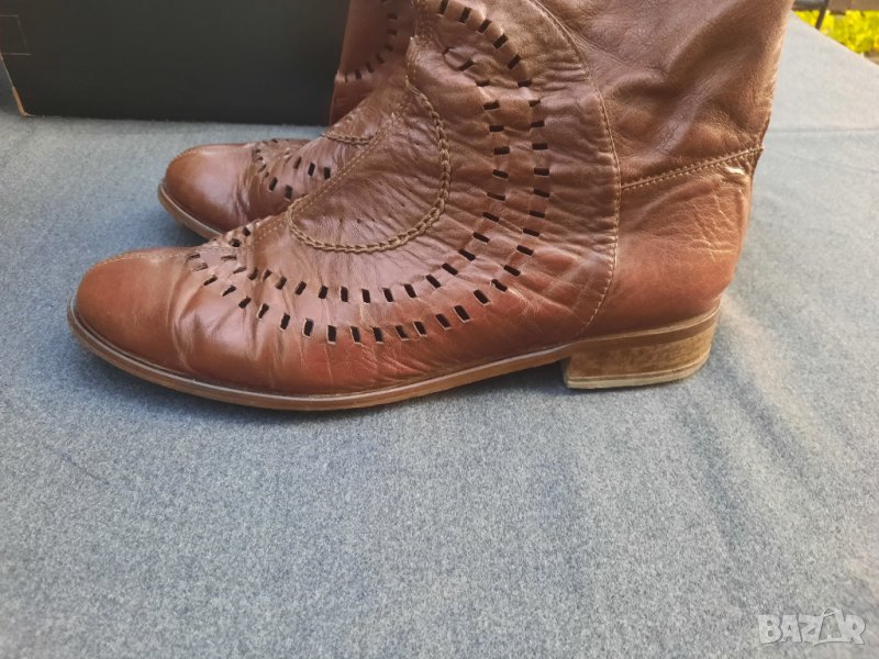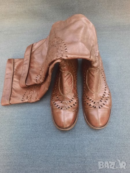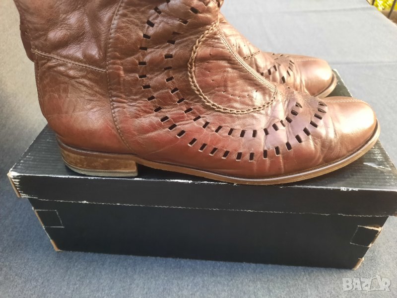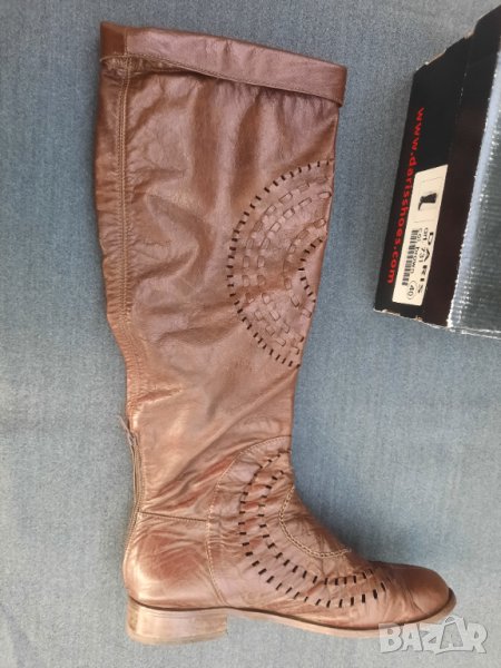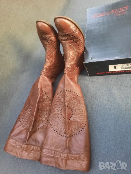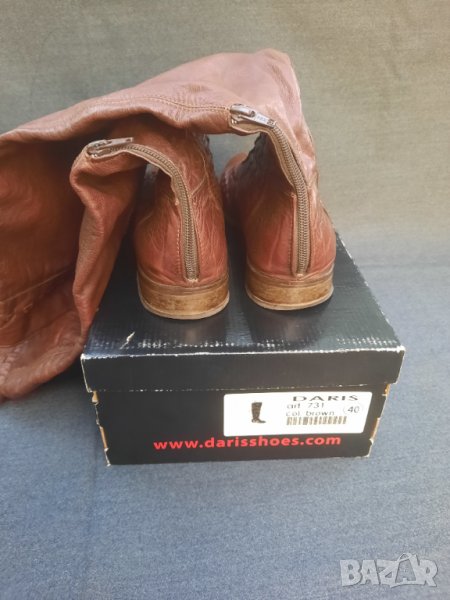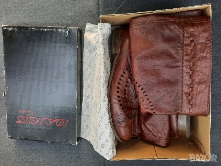 Ботуши пролетно – есенни №41 DARIS - естествена кожа, от обратната страна е велур. Стелка 27 – 27.5 см., също естествена кожа, в най – широката част 9 см., ток 2.5 см. Без подплата, мрежести. С ципове на петите, работещи. Височина на ботуша 50 см., обиколка в най – горната част 40 см. Ръчно изработени от висококачествени италиански материали. Няма нищо скъсано или ожулено. Много удобни. Производителят е известен на българския пазар с доброто си качество.