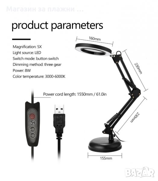 Регулируема настолна LED светлина и лупа 2в1