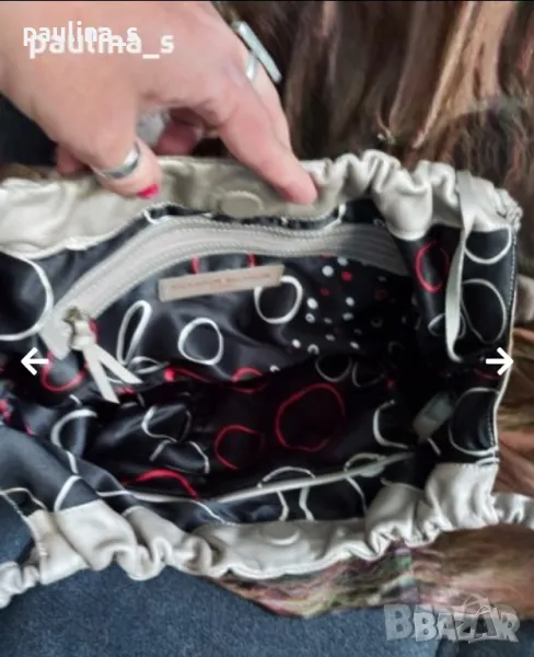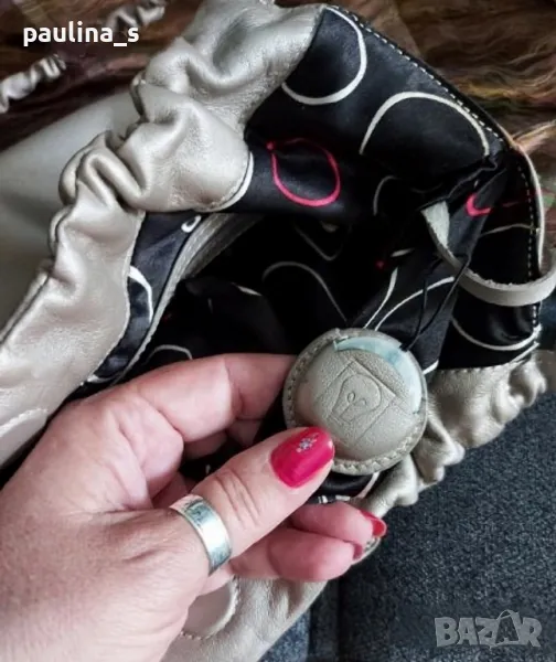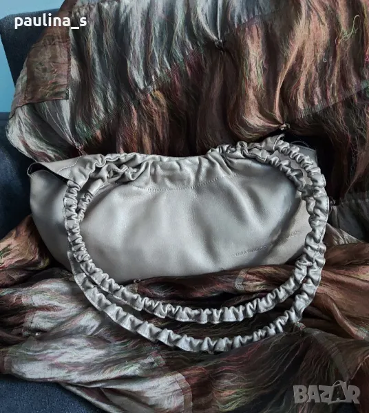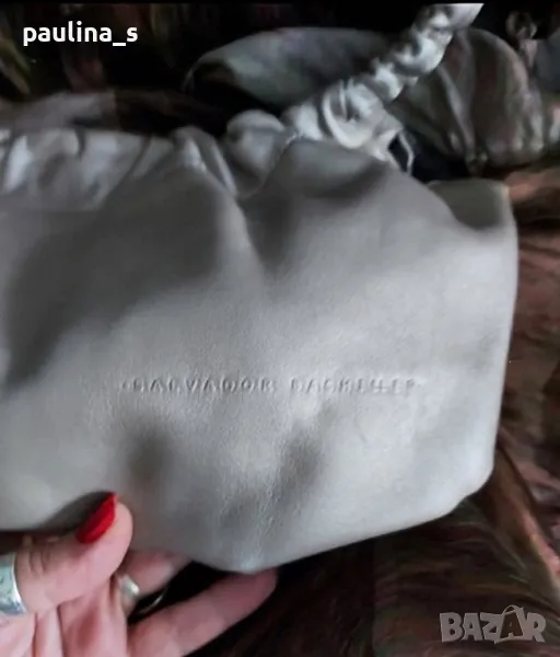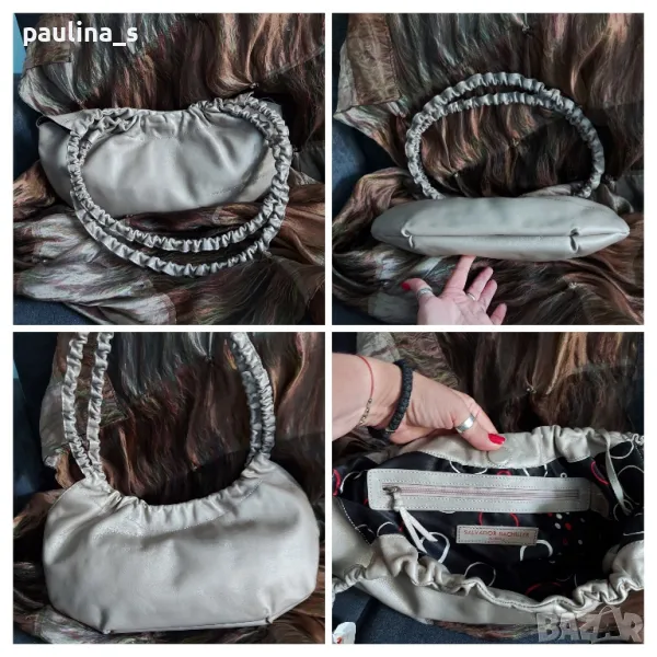 3️⃣. Колаж / Естествена кожа / Винтидж 2004г / Сребристо - перлена, дизайнерска чанта "Savador Bachiller". Цената е крайна 59,99лв / 30 евро. Дамска дизайнерска чанта от естествена кожа, цветът е сребристо сиво, доближава се до бяло. Дръжката е като на почти всички изделия на ластичен набор, което е като запазена марка на бранда. Има едно отделение, луксозен хастар и шнур за ключове, плюс фенерче за осветление, магнитно закопчаване. Без дефекти е, голяма тупалка. Батерията на фенера е за смяна. Размери - 37см / 19см / дръжка 57см до 70см.