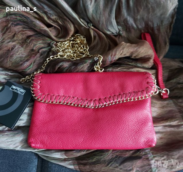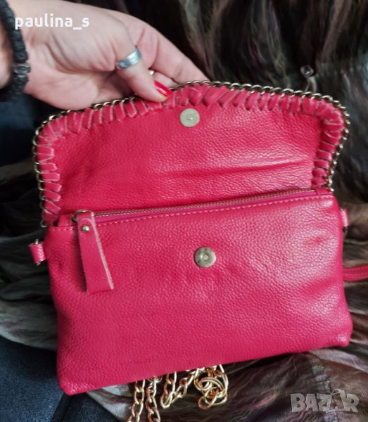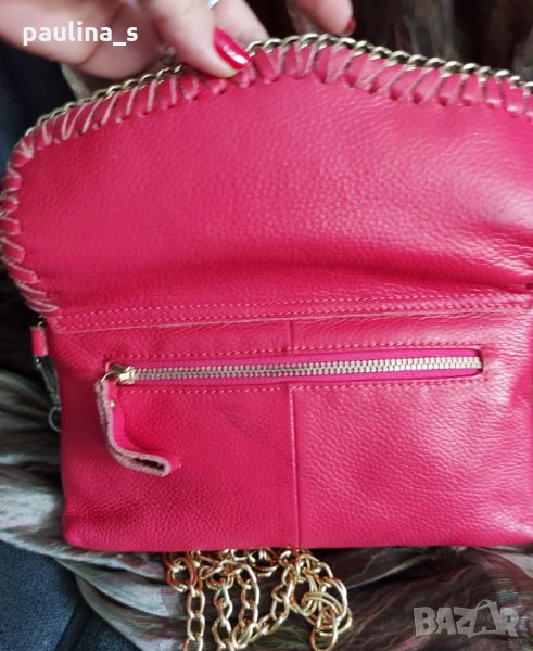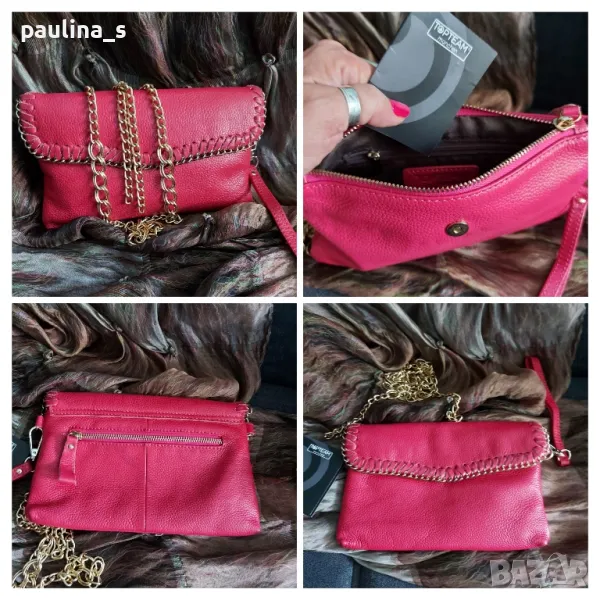 1️⃣ . Колаж / "TOPTEAM Munchen" / Винтидж 2004г. цвят Цикламѝно, Нова е. Цената е крайна 59,99лв / 30 евро. Естествена кожа, дамска маркова чанта в атрактивен цвят. Дългата дръжка се поставя. Съхранена с етикета, има незабележително петънце отзад под ципа, съобразена цена за бранда, ръчна изработка