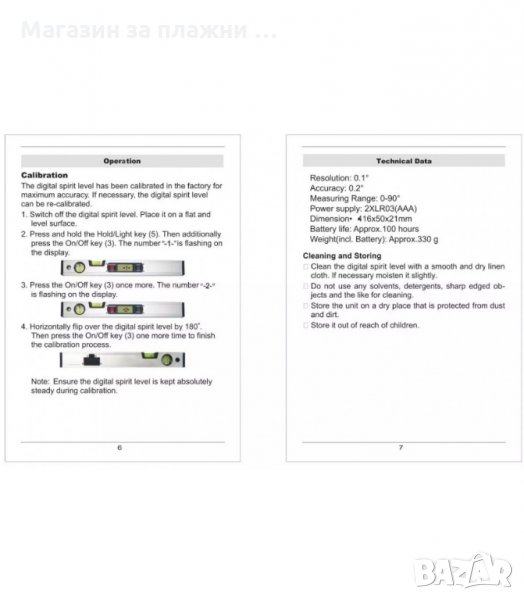 Дигитален нивелир/инклиномер позволява прецизно измерване в диапазон от 0 до 360˚ с допустимо отклонение от 0.1˚. Със същата точност, уредът измерва и наклон, като резултатите могат да се преобразуват в градуси и милиметри с точност до 100 мм/м. Захранва се от 2 x 1.5V AAA батерии с работен капацитет от 200 часа непрекъсната работа. Безпроблемната работа на измервателния уред е гарантирана при температурни амплитуди от 5 до 50˚С и при относителна влажност +/- 85%.