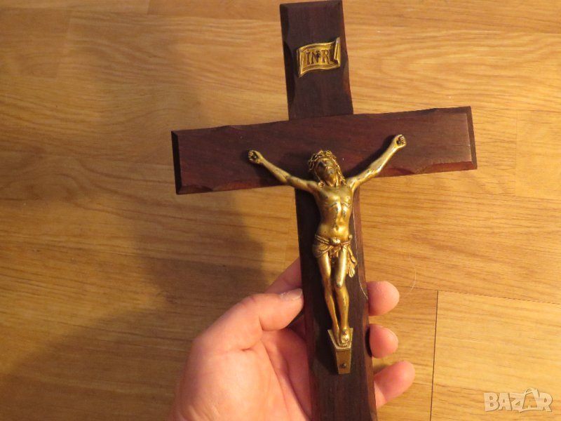 Кръстът е изработен от масивна дървесина, а лика на Исус е от метал.