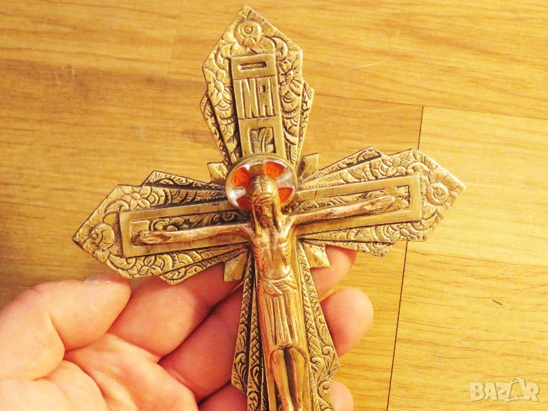 Солиден бронзов кръст разпятие Исус Христос 22х 13см - внос Израел, Йерусалим