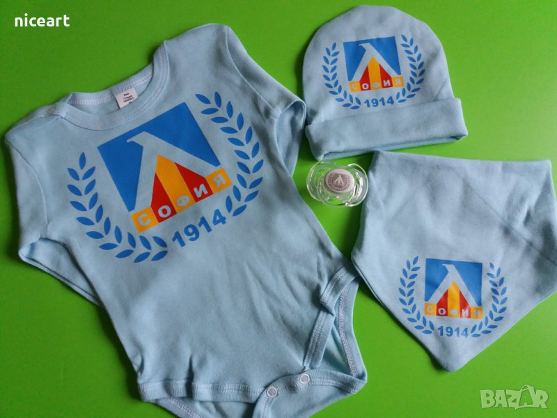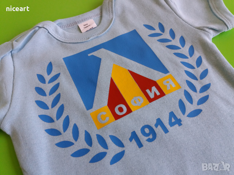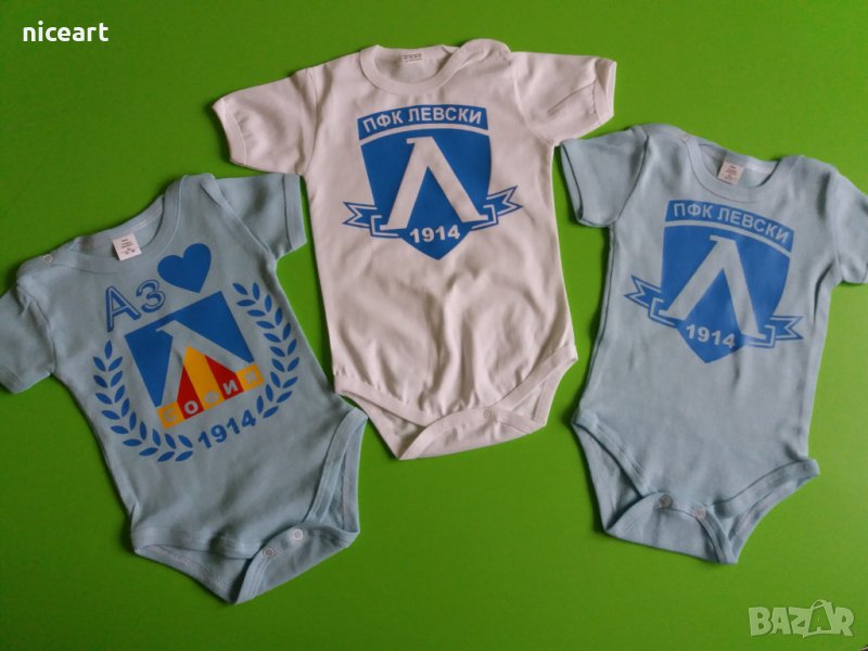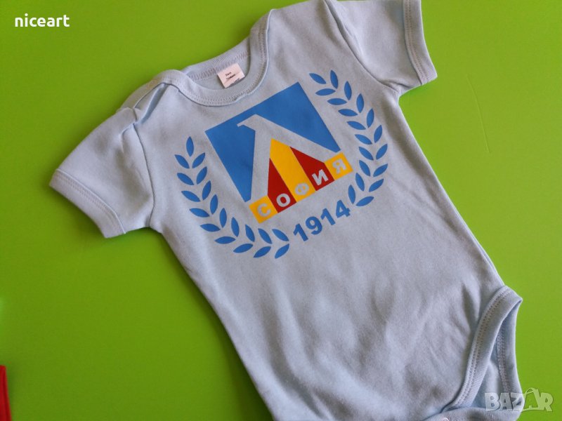 Левски София,материя на бодитата 100% памук.Изработваме и тениски,биберони,купичка с лъжичка,шишета за мляко и вода,термос ,лъжички за хранене и други артикули с емблема