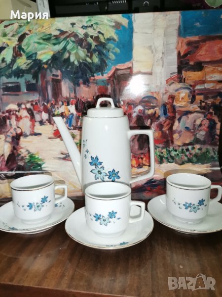 Български порцеланови чашки с чинийки, 3 броя чашки с 3 броя чинийки и кана с дръжка и капаче.