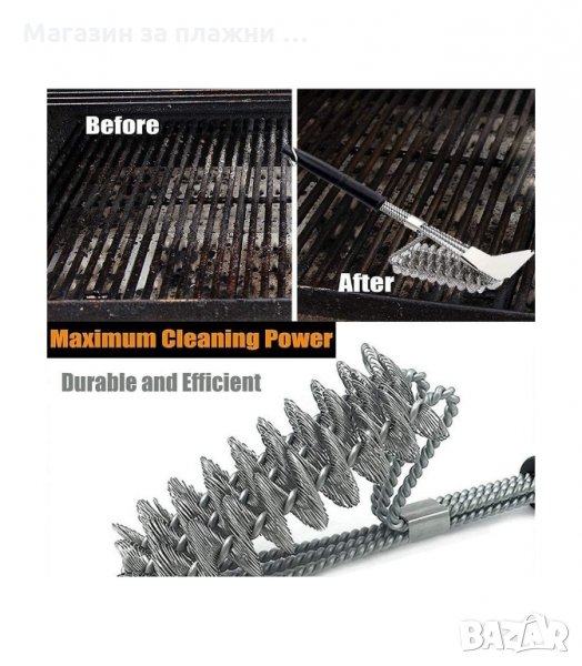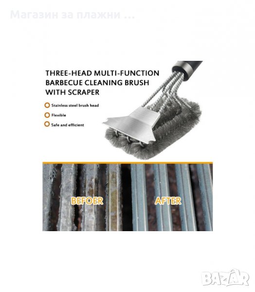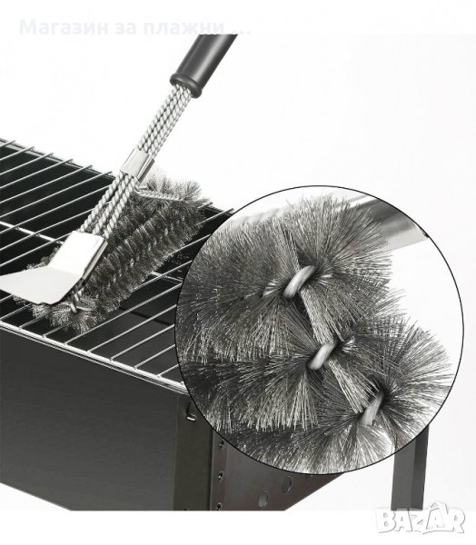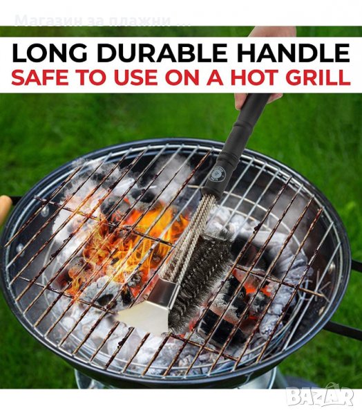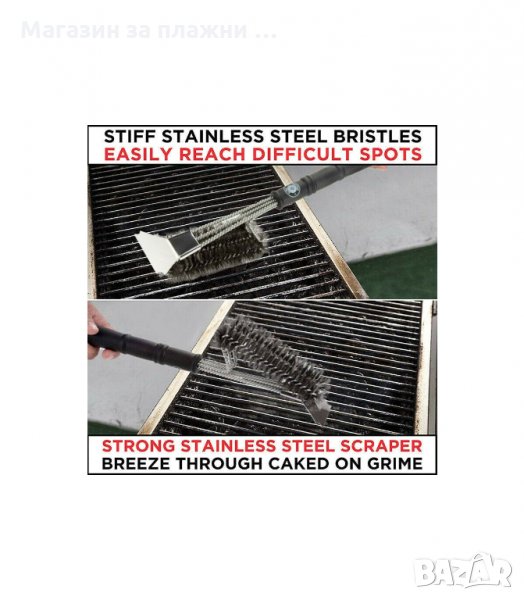Дизайнът позволява лесно и бързо, за няколко минути, да почистите Вашето барбекю. Четката е дълга 45 см и се състои от две или три по-малки, разположени една до друга четки. Изработена е от неръждаема стомана. Снабдена с удобна дръжка, изработена от много издръжлива пластмаса. С удобна кукичка за закачане на четката.