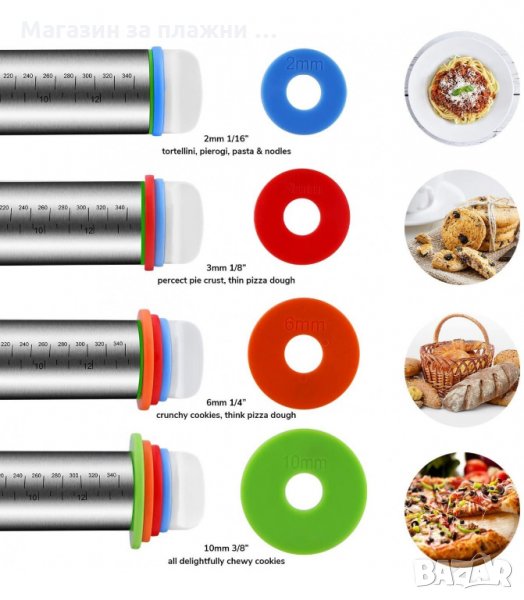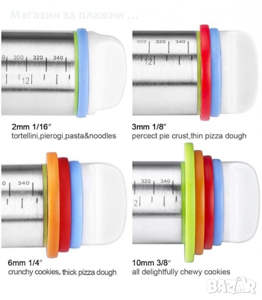 Тази точилка Ви позволява да регулирате дебелината на тестото според това, което приготвяте: пица, пай или друго сладкарско изделие. Тя е с четири комплекта сменяеми дискове, които са с различна дебелина (2 мм, 3 мм, 6 мм. и 10 мм.).