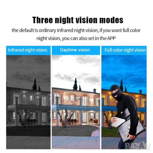 Инфрачервена светлина и бяла LED светлинаИнфрачервено нощно виждане, пълноцветно нощно виждане, интелигентно нощно виждане, три режима на наблюдение.