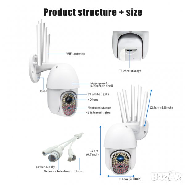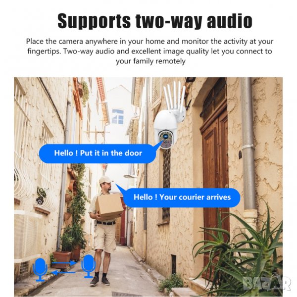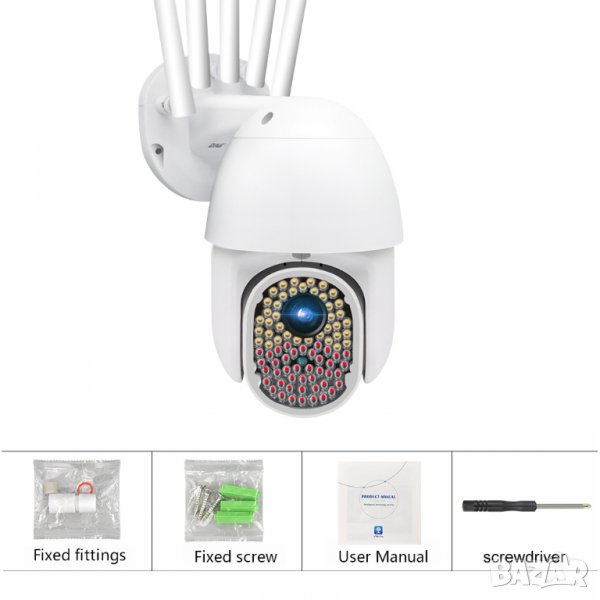 Wifi, Въртене, Full HD, Нощно виждане с 82 светодиода, Микрофон, говорител, водоустойчива, с 5 антени и др.
