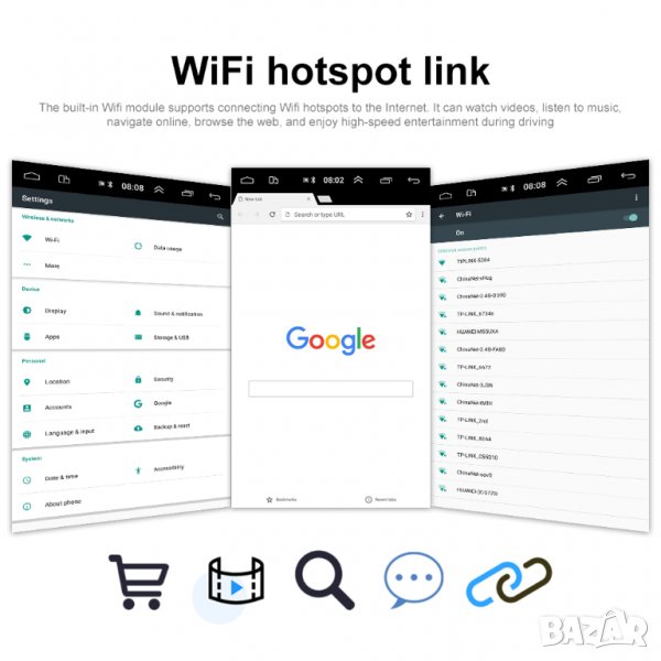 От Google Play Store можете да инсталирате всички любими и нужни приложения, както и тези, които има на вашия смартфон. Пуснете интернет като активирате Hotspot (интернет точка за достъп) от смартфона си и свържете мултимедията към интернет мрежата, за да се възползвате от безкрайните възможности, където и да сте. Пуснете видеа от YouTube и каквото още пожелаете. Система Android на български език.