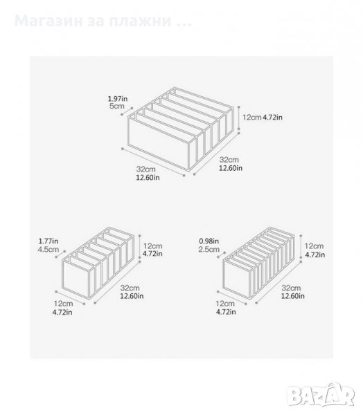 Размери: органайзер за сутиен със 6 пространства (12x 32x 32 см), органайзер за чорапи с 11 пространства (12x32x12cm), органайзер за бельо със 7 пространства (12x32x12cm)