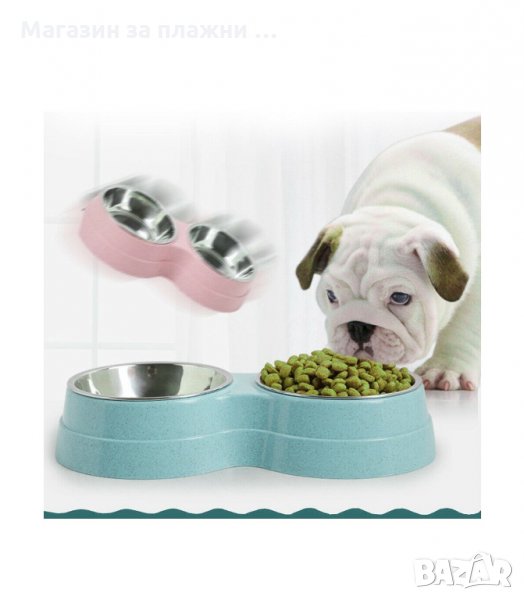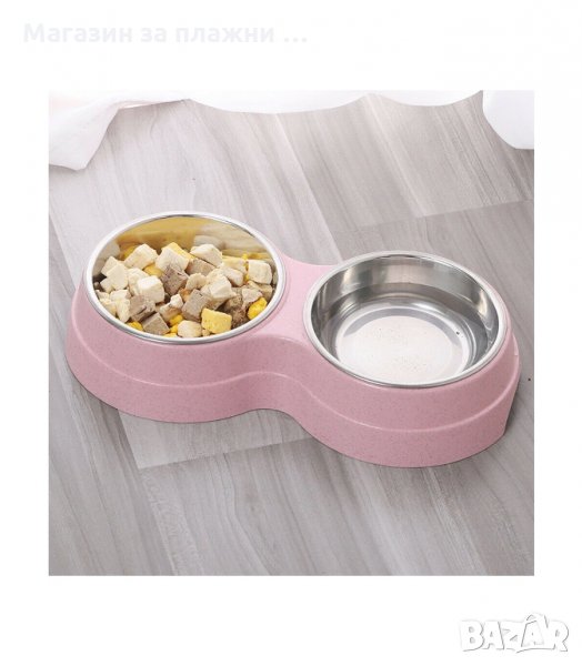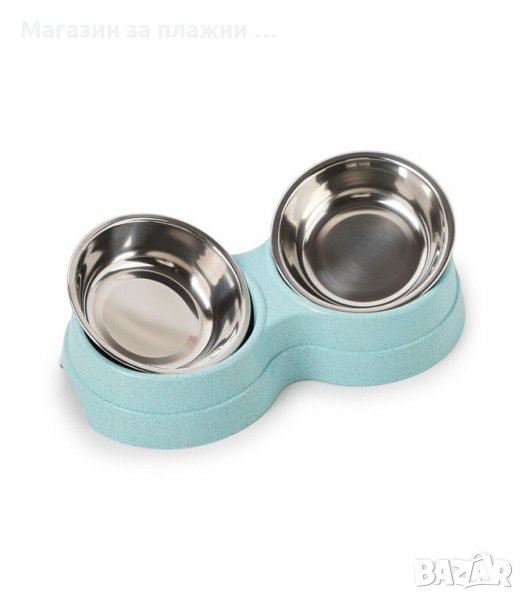 Двойна хранилка пластмасова с метални купички, подходяща за котки и дребни кучета