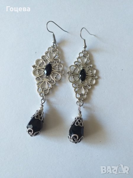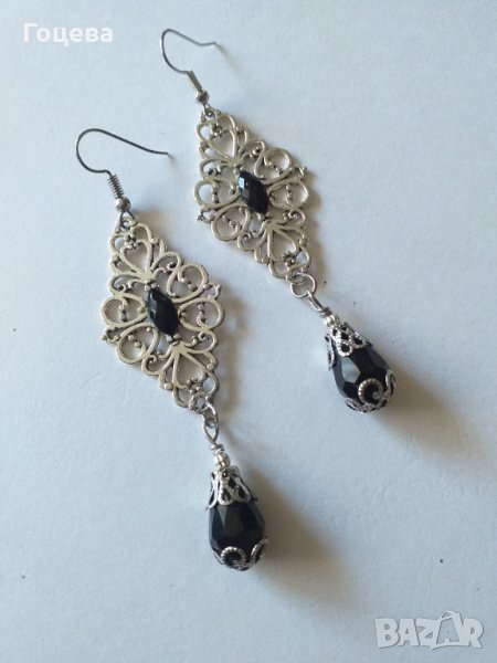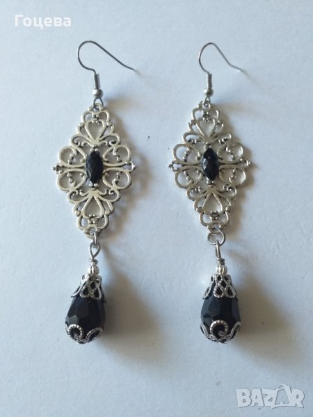 Разкошни обици във Викториански стил с черни кристали и орнаменти в цвят Сребро → Обява 34145942