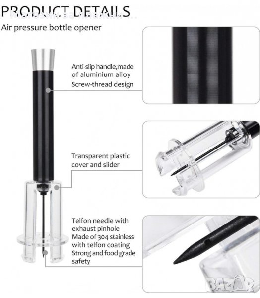 Предлагаме 2 модела на тирбушон за вино с въздух: с пластмасова дръжка и с алуминиева дръжка. Между двата модела няма друга разлика освен материала на дръжката, както и малката разлика в цената.С помощта на този тирбушон отваряте бутилки вино от всякакъв размер и качество лесно и безопасно. Не е подходящ единствено за шампанско и пенливи вина.