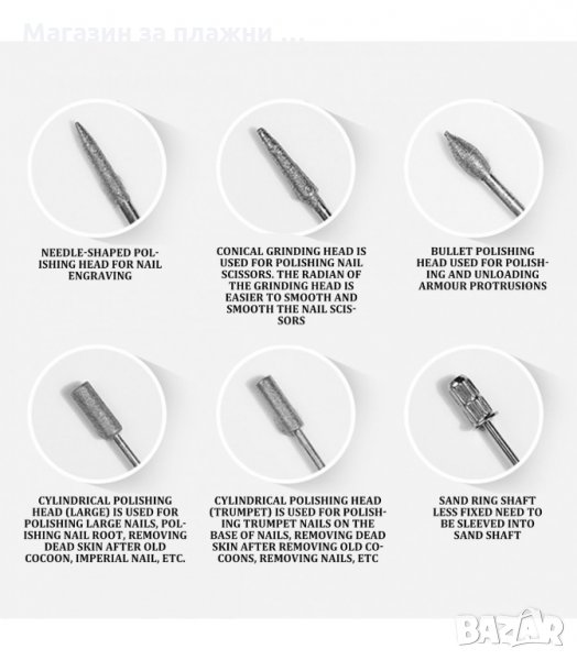Електрическата пила нокти може да се използва, както за естествени, така и за изкуствени нокти. Подходяща за професионална употреба в салон или в домашни условия. Към пилата има шест приставки, всяка от които има специално предназначение. С помощта на лентите за полиране, може да изпилявате ноктите по-фино или по-грубо, в зависимост от предпочитанията.