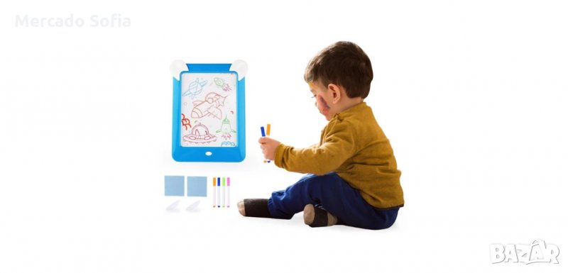 Вълшебна ярка дъска с 10 карти за оцветяване и 4 маркера. Поставете картата на дъската, нарисувайте я с маркерите и я извадете, когато приключите. След това поставете черна карта на дъската и натиснете бутона, за да включите светлината. Вижте вашите проекти осветени магически! Променете цвета на светлината или изберете един от 6 -те режима на осветление. Почиствайте панелния дисплей лесно с чистите кърпи, които се съдържат. Може да се поддържа със съдържащите се вендузи.