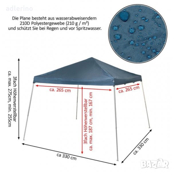 3,3 х 3,3 метра / покрив (отгоре): 2,65 х 2,65 метра, тегло: 11 кг,