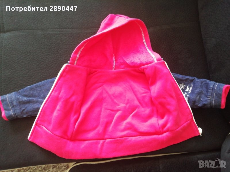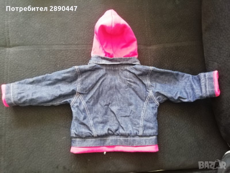 2. Тъмносиньо дънково якенце, подплатено с памучна подплата (цвят фуксия). Подходящо за по-хладните есенни дни. Качулката е уплътнена с полар. Единствената следа от употреба е леко олющване на събирача на ципа.