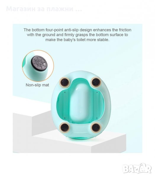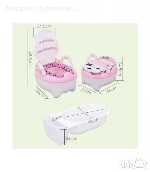 Продуктът е с формата на тоалетна чиния; капаче, което се вдига и сваля; вътрешно изваждащо се контейнерче за лесно почистване; дръжки от двете страни на седалката на гърнето, които осигуряват допълнителна сигурност и комфорт на детето.