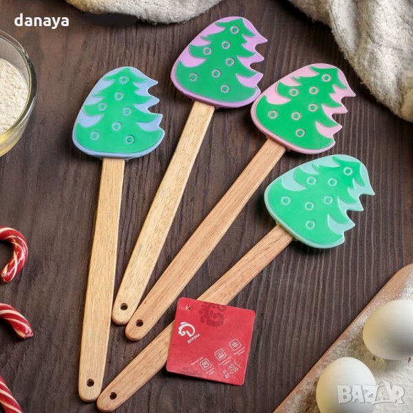 Кухненска силиконова шпатула, лопатка за разбъркване и готвене с форма на коледна елхичка. Красив, цветен дизайн. Дръжката е дървена с дупка за закачане. Шпатулата е удобна за мазане, обиране и разнасяне на глазури, подходяща за горещи повърхности.
