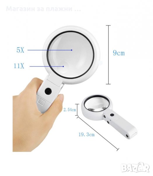 Професионална компактна универсална ръчна и настолна лупа с 8 LED осветление с голямо увеличение 5X и 11X диаметър 75мм регулиране силата на светене и два вида захранване за четене, шиене на гоблени, бродиране, бродерия, козметик, бюро, часовникарска за работа, злато, електроника, рисунки, рисуване, свободни ръце, телефон, монитор, компютър, монети, маникюр, платки, проверка на лична карта и банкноти, запояване, диаманти, документи, деца, десктоп, насекоми, маса, марки и др.