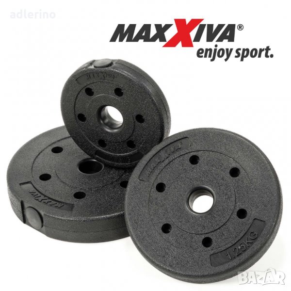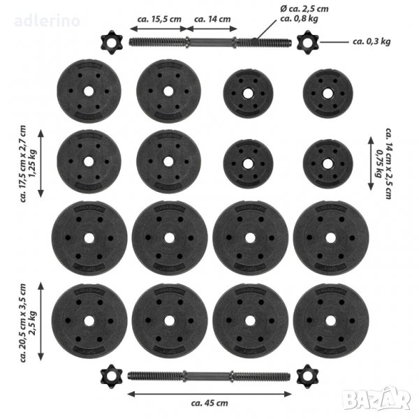 2,5 кг, 4 х 1,25 кг и 4 х 0,75 кг. Тренировъчно тегло от 15 кг е