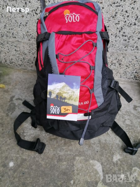 Продавам нова раница около 40 литра с дишащ гръб Solo Futura 60. Раницата има мрежа на гърба с дистанция за вентилация. Има колан на кръста и пред гърдите. Има мрежести джобове отстрани с коланче за прикрепяне. Има и ластик със стопер за пристягане. Има две вертикални помещения, затварящи се с ципове. Има малко външно джобче с цип. Има и външна платка с колани за прикрепяне на каска или друг багаж. Има и гумирана дръжка за носене. Има долу светлоотражателна лента.