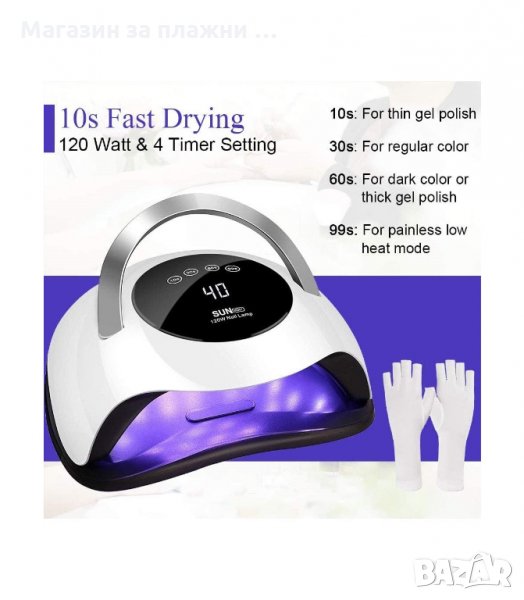 – Време за сушене гел лак – 10 секуди. Гел полимеризация – 30 секунди, лампата работи с всички гелове и гел лакове.