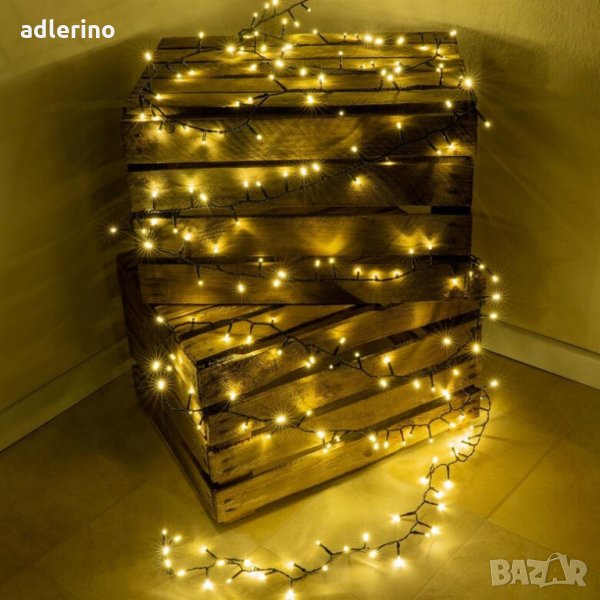 LED верига с 2000 лед светлини свети в красива топло бяла светлина.