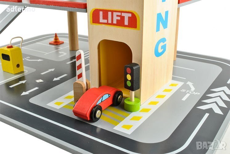 има многоетажен паркинг с мобилен асансьор, автомобили, хеликоптер,