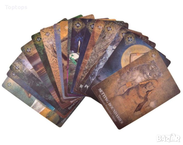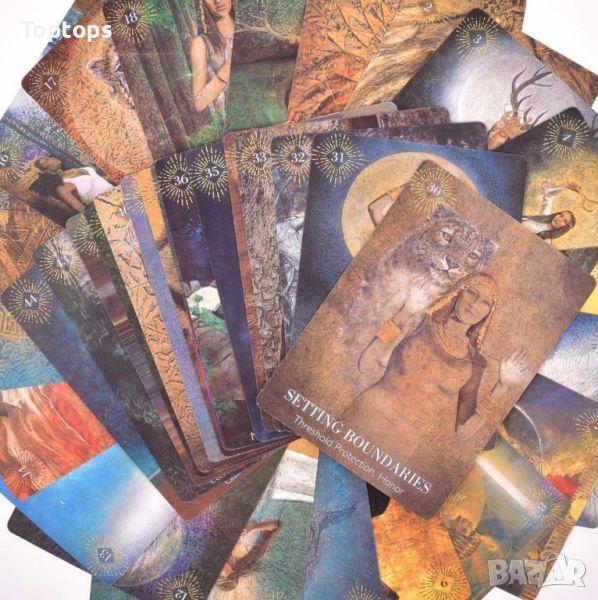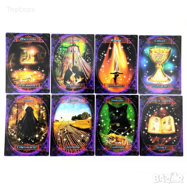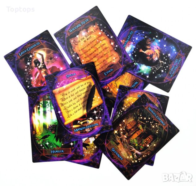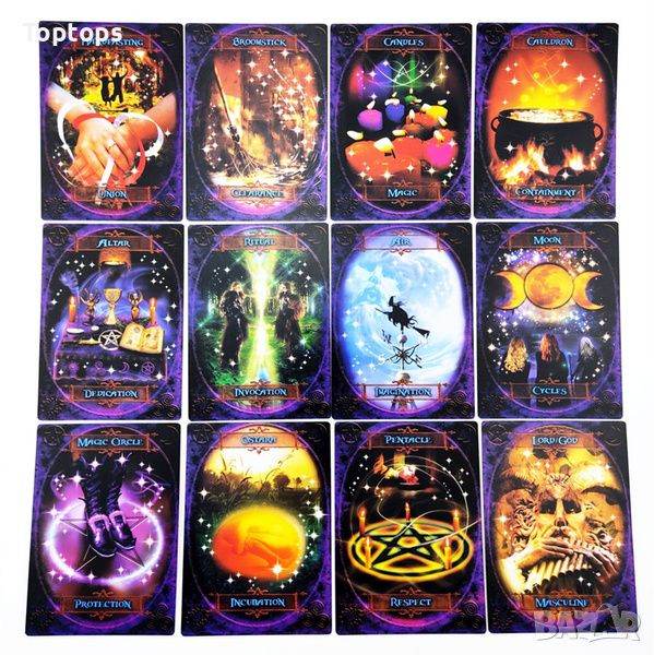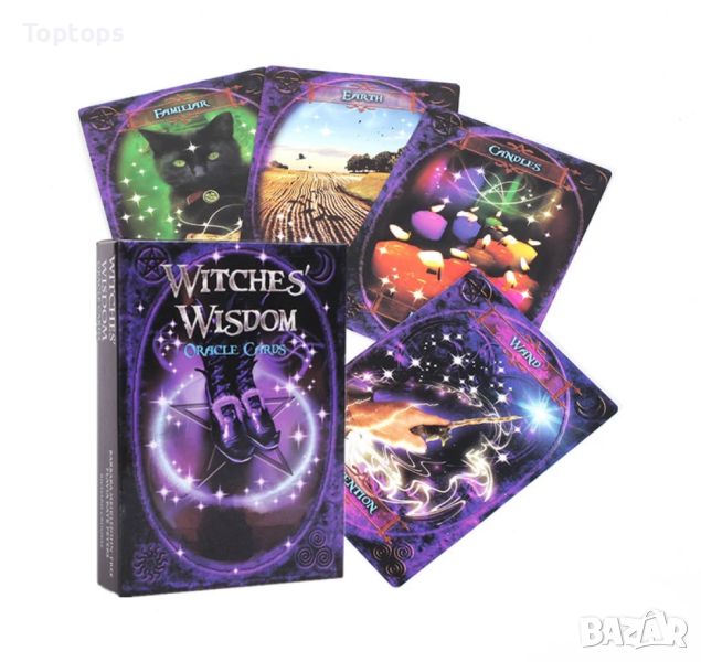 - 48 оракул карти - Witches Wisdom Oracle заедно с pdf файл с инструкции на английски. Размерът им е 10,2см х 7,5см, автори са Barbara Meiklejohn-Free и Flavia Kate Peters.