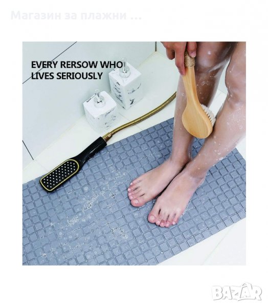 Постелката има малки вендузи, с които залепва здраво към пода на банята, като по този начин не се хлъзга и ви осигурява стабилност и безопасност. Освен това осигурява лек и приятен масаж на стъпалата, благодарение на релефните стъпки върху нея.