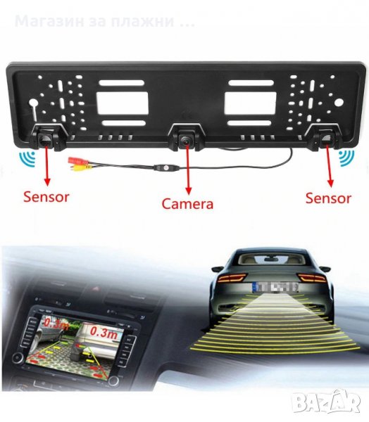 Модерна камера, вградена в рамката на регистрационния номер. Камерата позволява лесен и удобен начин да видите какво се случва зад превозното средство.Тя перфектно решава проблема с паркирането на трудни места, така че тази маневра да стане детска игра. Устройството се свързва с монитора с видео входа. Камерата е водоустойчива и удароустойчива. Рамката допълнително има LED задно осветяване. Възможност за задаване на ъгъла на камерата.