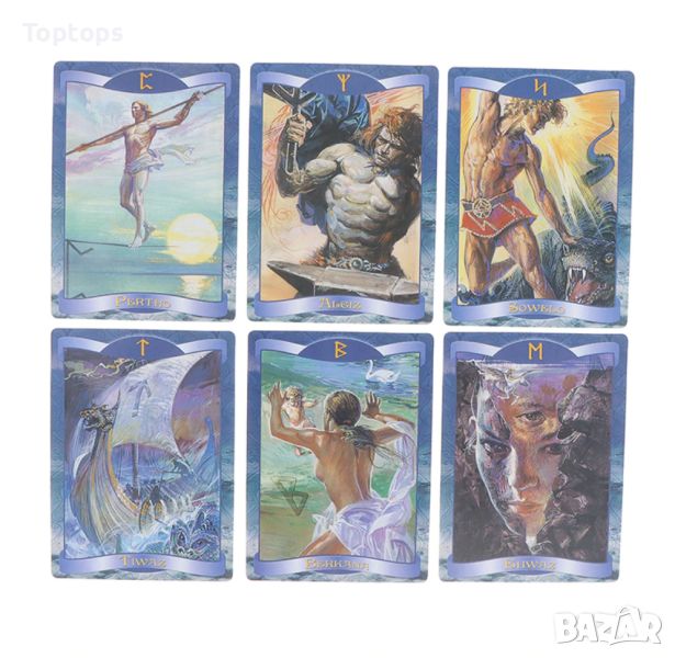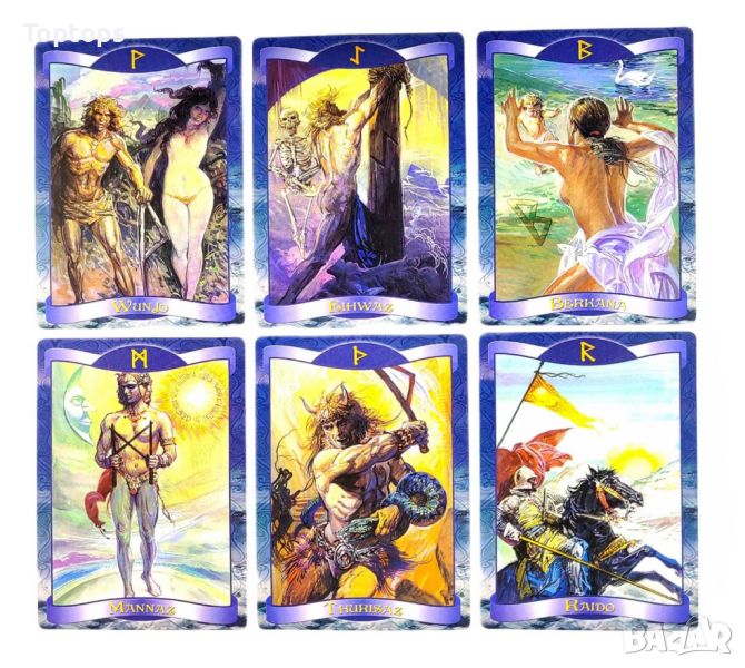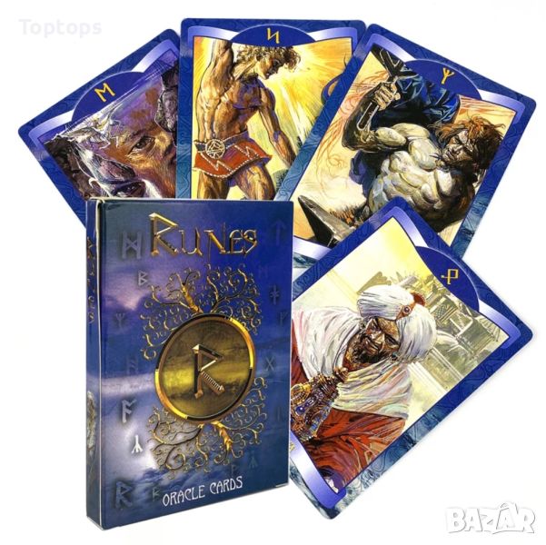 - 24 оракул карти с руни - Runes Oracle Cards. Размерът им е 10,5см х 7,5cм, колодата е създадена от Loscarabeo.