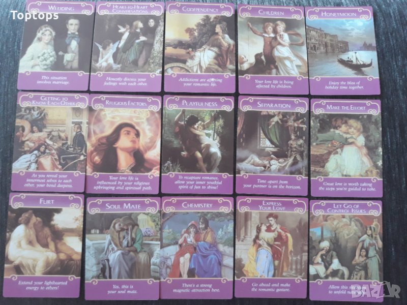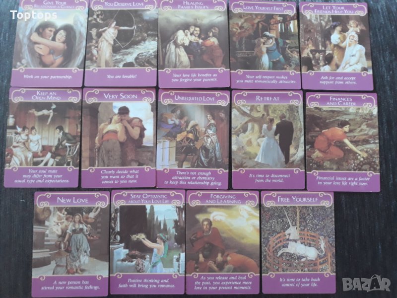 * The Romance Angels - преводът е "Романтичните Ангели" и това е най-известната оракул колода за любовни гадания от вече повече от 10 години. В картите има насоки за съществуващи ситуации, бъдеща любов и всички въпроси свързани с любовта. Върху всяка карта има кратка насока, пълното значение е в pdf книжката.