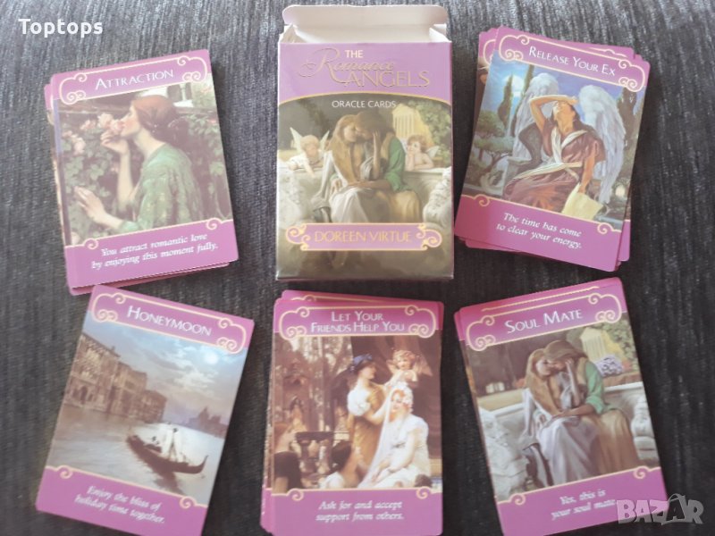 - 44 оракул карти - The Romance Angels заедно с пдф файл с инструкции на английски. Размерът им е 10,5см х 7,5см, колодата е създадена от Doreen Virtue.