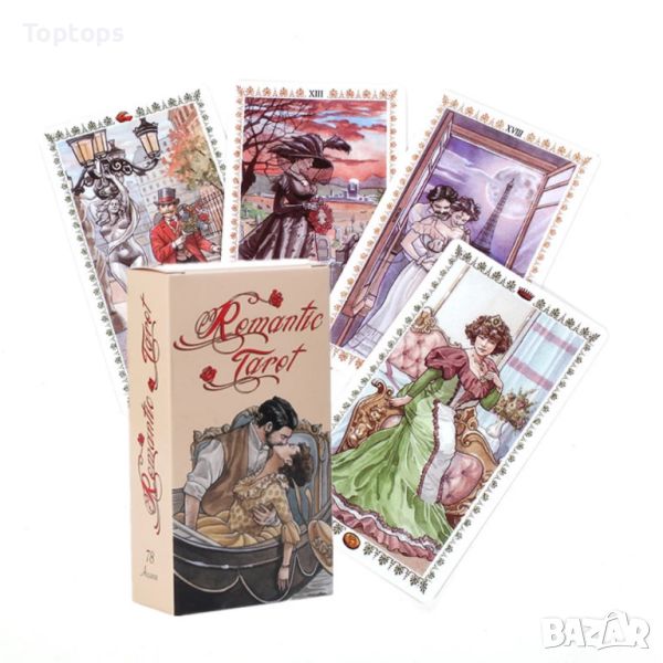 *Romantic Tarot е много нежна и мека колода. Името ѝ ясно показва какъв е фокусът на картите - любовни и романтични картини. Перфектни карти за любовни гадания! Големите аркани са с римска цифра, а малките аркани с арабска цифра и символ за боята.