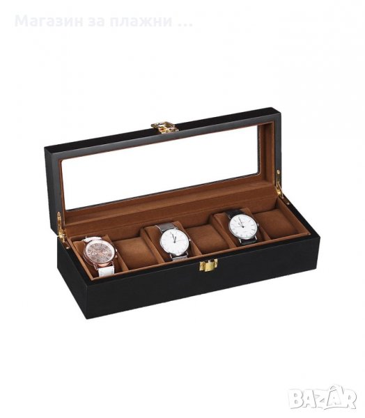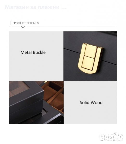 Кутията за часовници е изработена от дърво и на капака отгоре има стъкло. Подходяща за съхранение на ръчни часовници, гривни и други бижута и аксесоари. Кутията е с подвижни кадифени възглавнички. Всяко отделение е с размери 9 х 4.5см