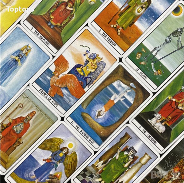- 78 таро карти Thoth Tarot, с пдф файл с инструкции на английски. Размерът им е 10,5см х 6,3см, колодата е създадена отAleister Crowley и Lady Frieda Harris.