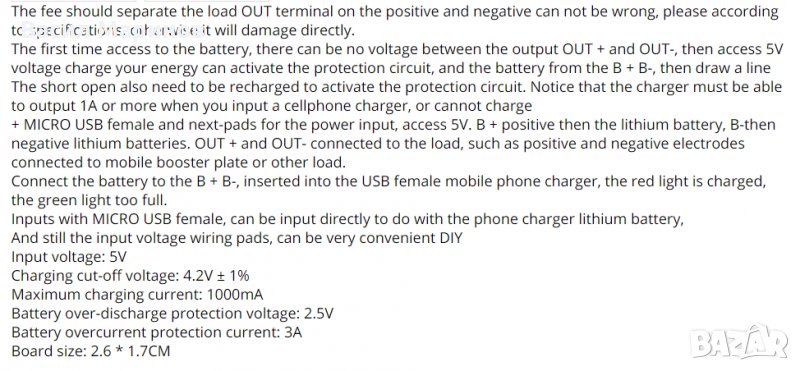 Предлагам защитна платка за зареждане и разреждане на литиеви батерии (Li-ion / Li-po) с номинално напрежение 3.7V на клетката и максимално 4.2V. Платчицата зарежда батерията през USB порт с до 1А ток, може да се зарежда директно през зарядното на телефона ви или друг източник на 5V напрежение.