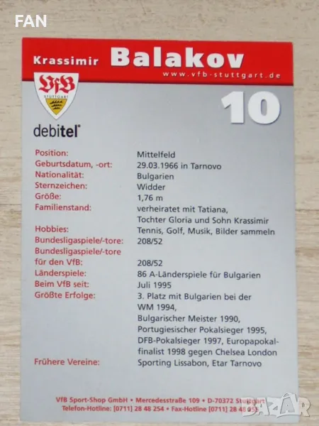 Предлагам картичка с АВТЕНТИЧЕН, саморъчно написан автограф с маркер на Красимир Балъков с екипа на Щутгарт от сезон 2002/03, който е и негов последен за отбора, както състезател.